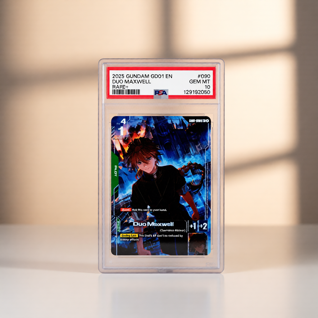 Discover the legendary 2025 GUNDAM NEWTYPE RISING #090 DUO MAXWELL RARE+ – a pristine PSA 10 collectible that embodies cutting‑edge design, flawless paintwork and unmatched detail. This ultra-rare card showcases the iconic Dual Maxwell with its premium plastic construction for durability. With a unique foil finish and an exclusive holographic, collectors will appreciate its standout aesthetic and high resale value. Perfect for display, gifting or adding to any Gundam collection, this rare piece offers rarity, quality, and the ultimate fan experience.
